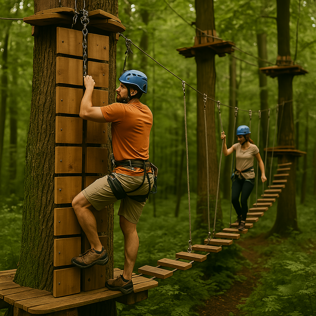 Δοκίμασε τις φυσικές σου δυνατότητες στο φυσικό περιβάλλον. Οι εναέριοι διάδρομοι και οι αναρριχητικές διαδρομές προσφέρουν διασκέδαση για όλα τα επίπεδα.